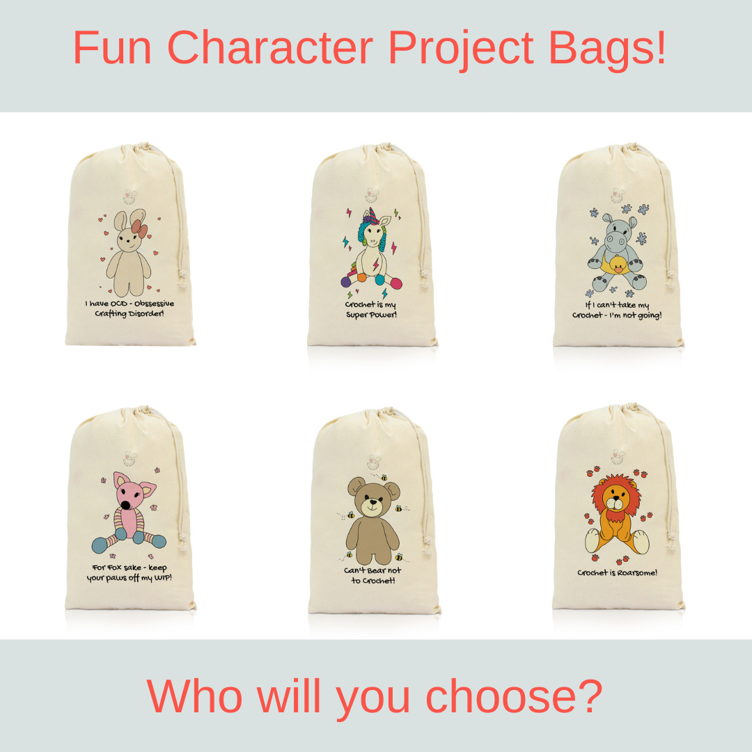 A 100% cotton project bag, with cute, quirky, and fun designs!  Choose your favourite from lots of different designs, and have the cutest reusable project bag in anyone's stash!!