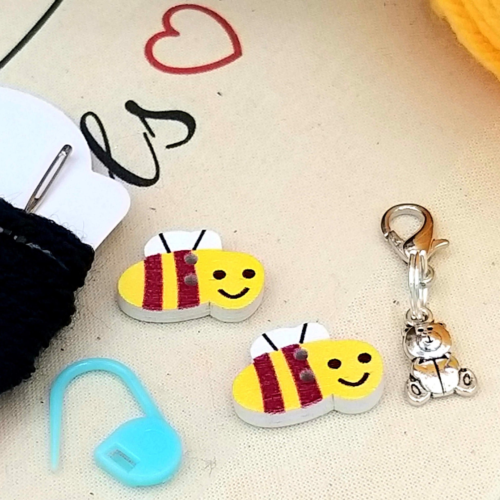 - A small organza bag containing a wide eyed needle for sewing, a colourful locking stitch marker, a bear shaped stitch marker, and 2 very sweet wooden bee shaped buttons for his raincoat