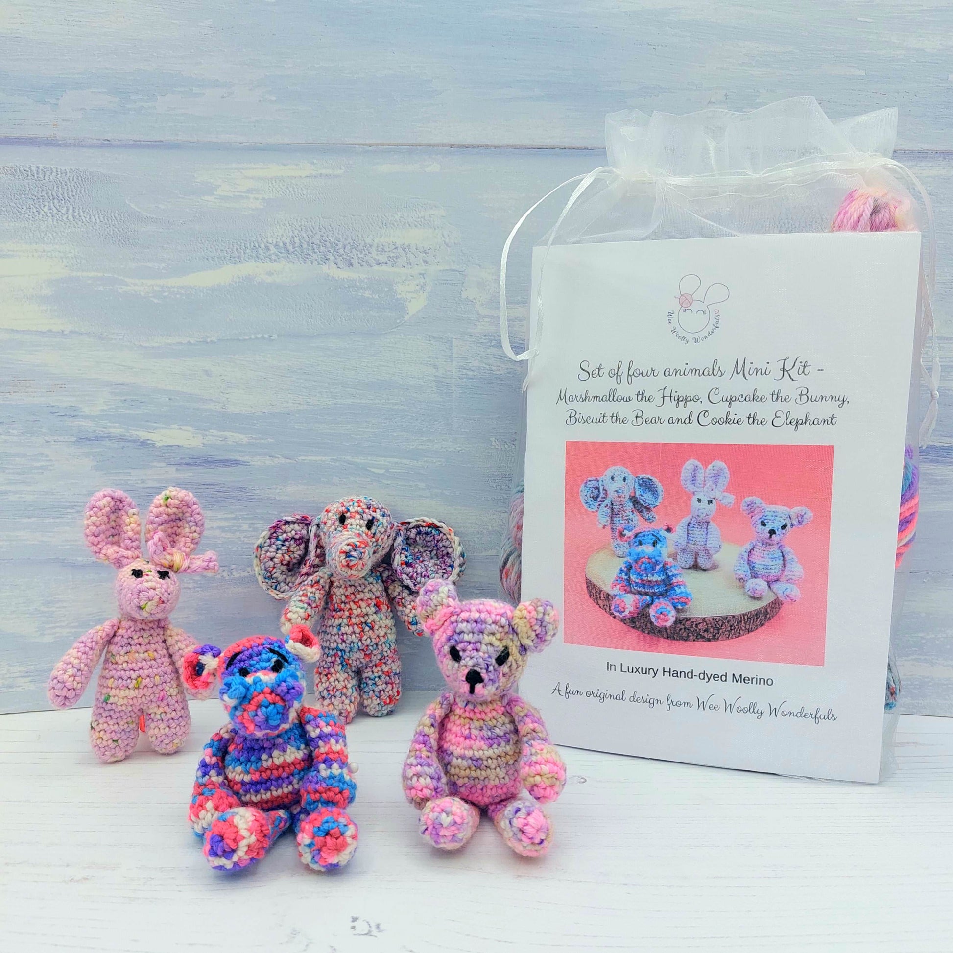 What could be cuter than mini baby animals in a pretty luxury Hand-dye wool? Meet Marshmallow the Hippo, Cupcake the Bunny, Cookie the Elephant and Biscuit the Bear!