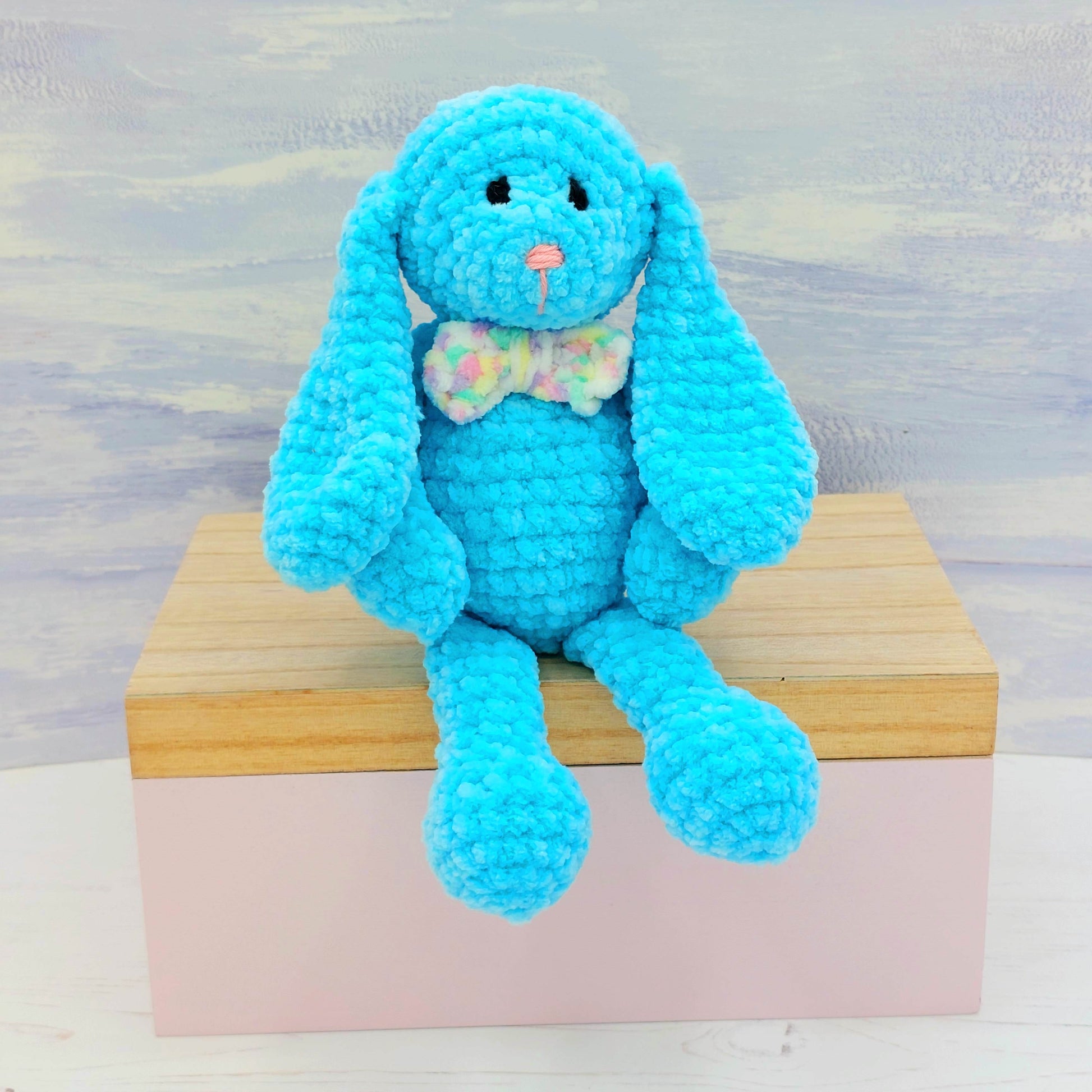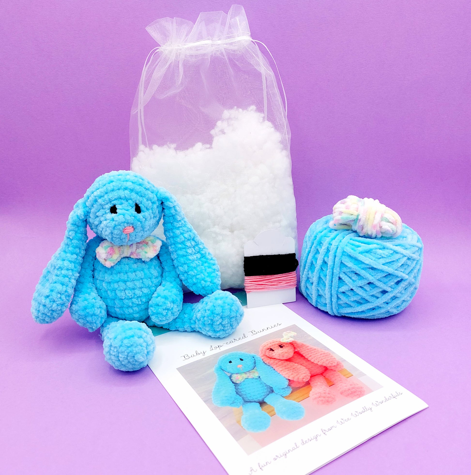 Our Baby lop-eared Bunny kit is available in Pretty Coral or Sky Blue, select your favourite when ordering. The finished bunny stands 22cm tall from her fluffy toes to the top of her head, or around 16cm when seated. The yarn is a supersoft, chunky Chenille in 100% Polyester, making the kit suitable for a vegan.